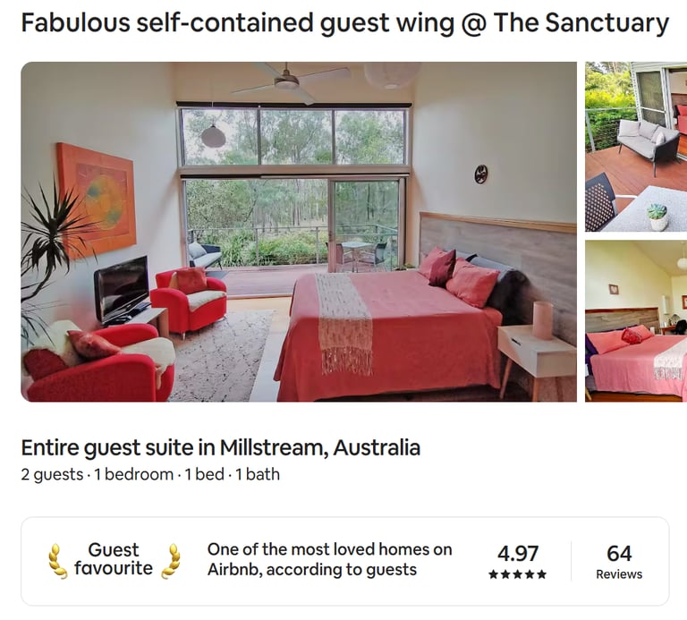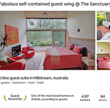 Maia's place is called Sanctuary and that what it is. Outstanding surroundings with total privacy. Maia and Drew are the complete hosts, respectful of your needs and wants and go above and beyond to ensure we had a great stay. A very comprehensive kitchen and superb bathroom capped off a truly memorable stay. Abundance of wildlife from wallabies to the many colourful varieties of birds are so close to your deck. Certainly, the ideal location for a peaceful and definitely restful stay. The local area has so many interesting attractions too. Highly recommended.